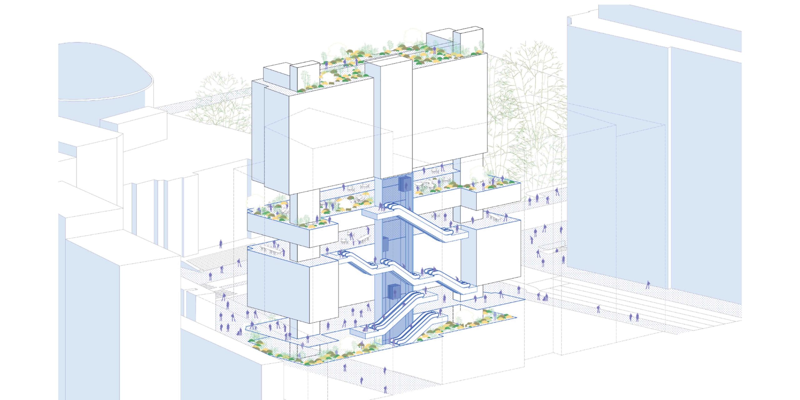 As grandes lojas de departamento, como o Mappin, tiveram seus primórdios na metrópole do XIX. Em sua forma mais singela, essa tipologia não passava de uma estreita rua coberta por uma estrutura de vidro. Bastou isso para que os edifícios lindeiros a ela descortinassem seus térreos como antiquários, cafés e livrarias. Um longo desenvolvimento apagou esse passado, produzindo espaços agigantados e enclausurados, como o shopping-center. A cidade do XXI tende a abrir seus interiores novamente. Atentando-se às múltiplas camadas de uma memória urbana sedimentada, o Sesc Galeria aqui proposto volta-se ao sentido original das galerias, isto é, enquanto passagem, rua-galeria – ideia que está contida também na formação do centro novo de São Paulo quando, em meados dos anos 1950, icônicas passagens – dentre as quais a Galeria do Rock e a Metrópole – moldaram a imagem de uma cidade aberta.