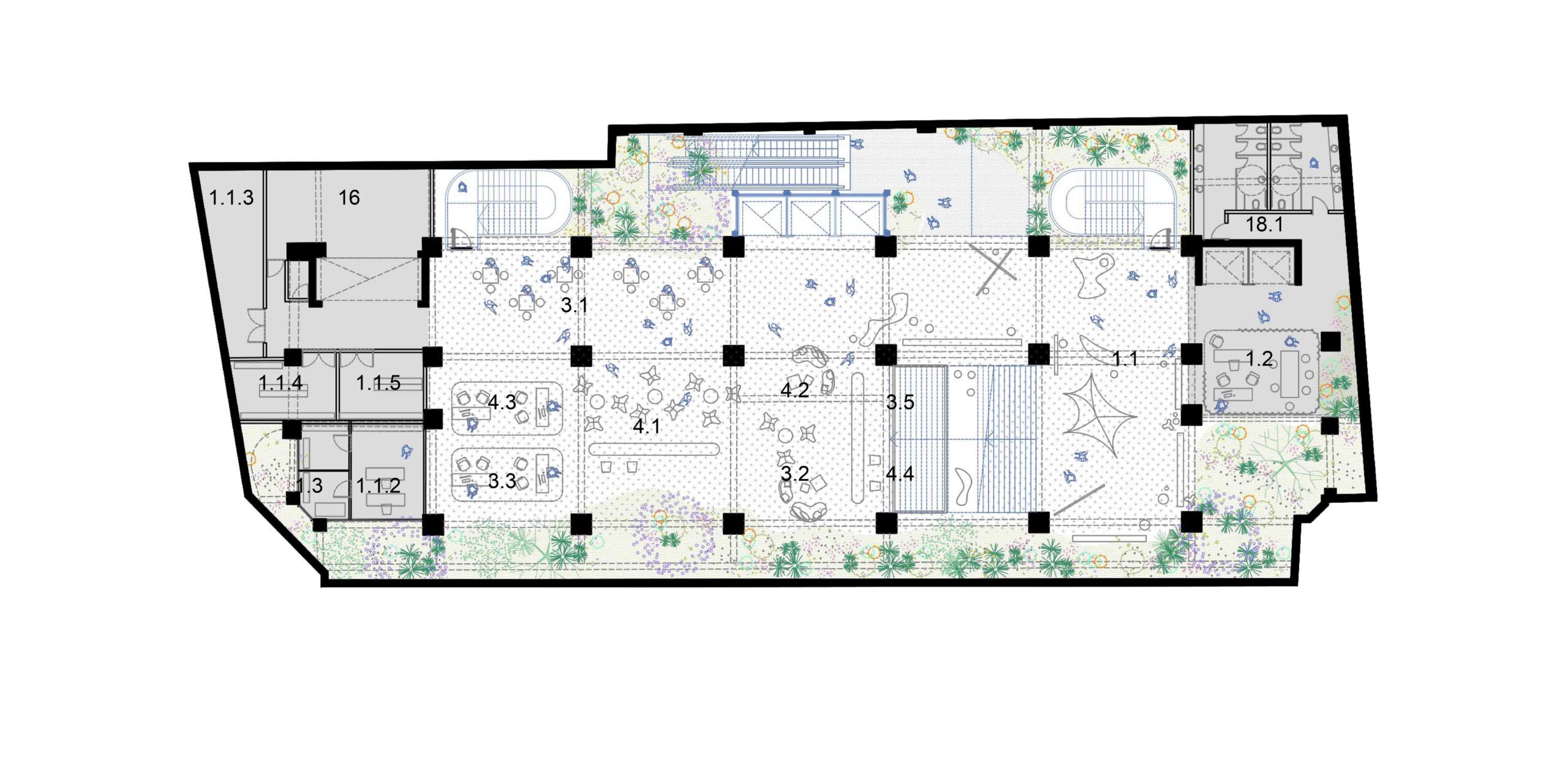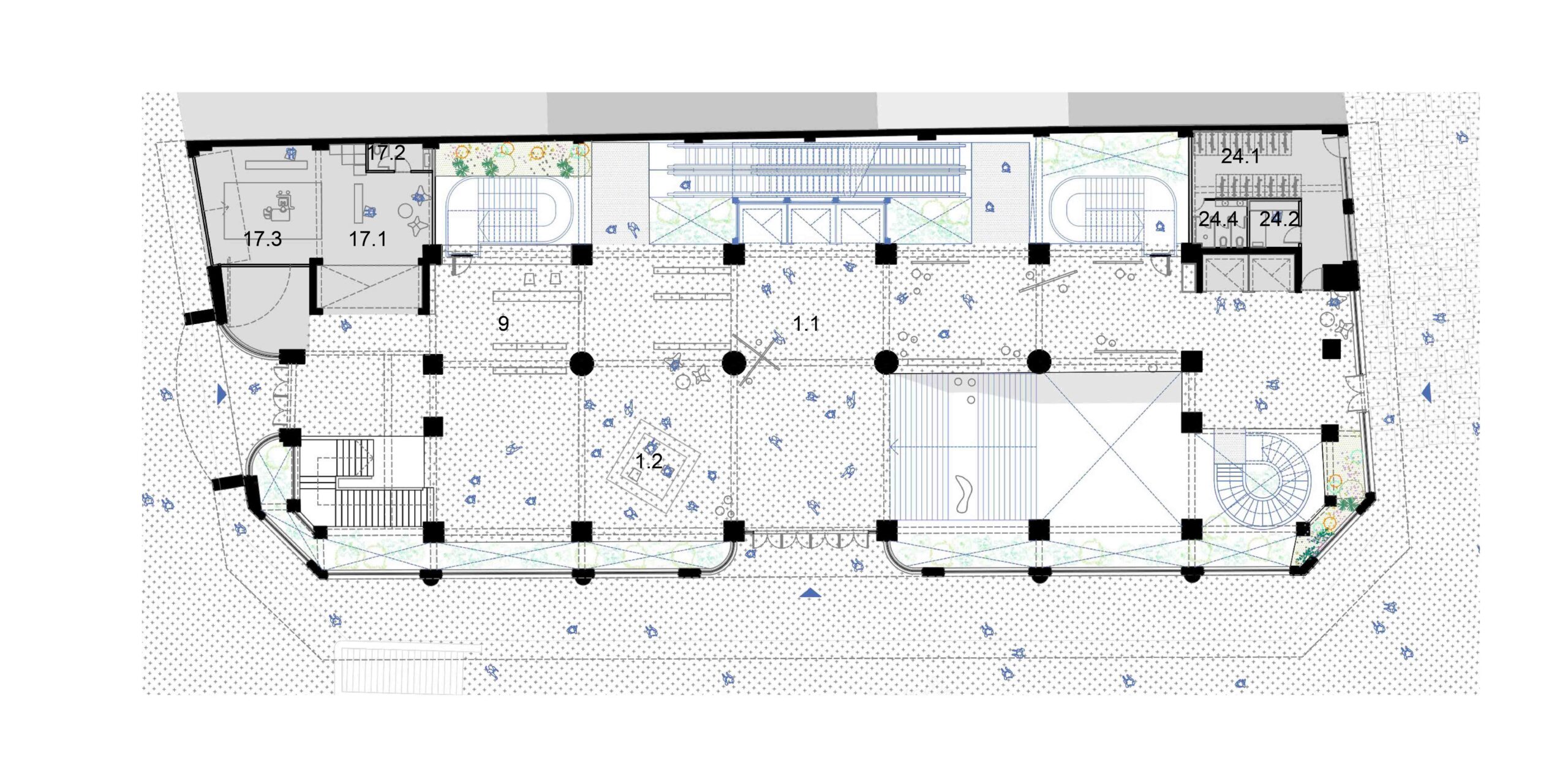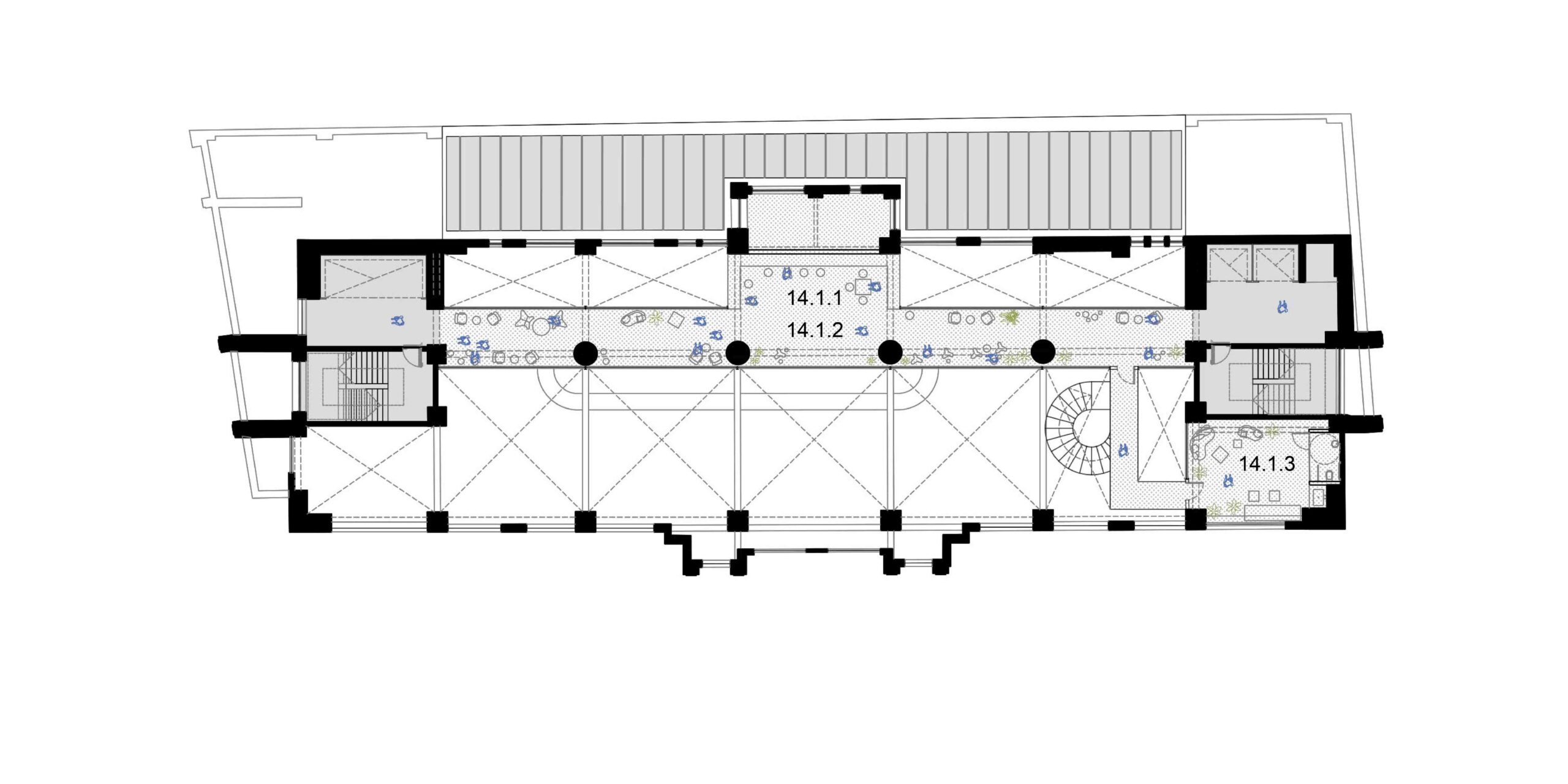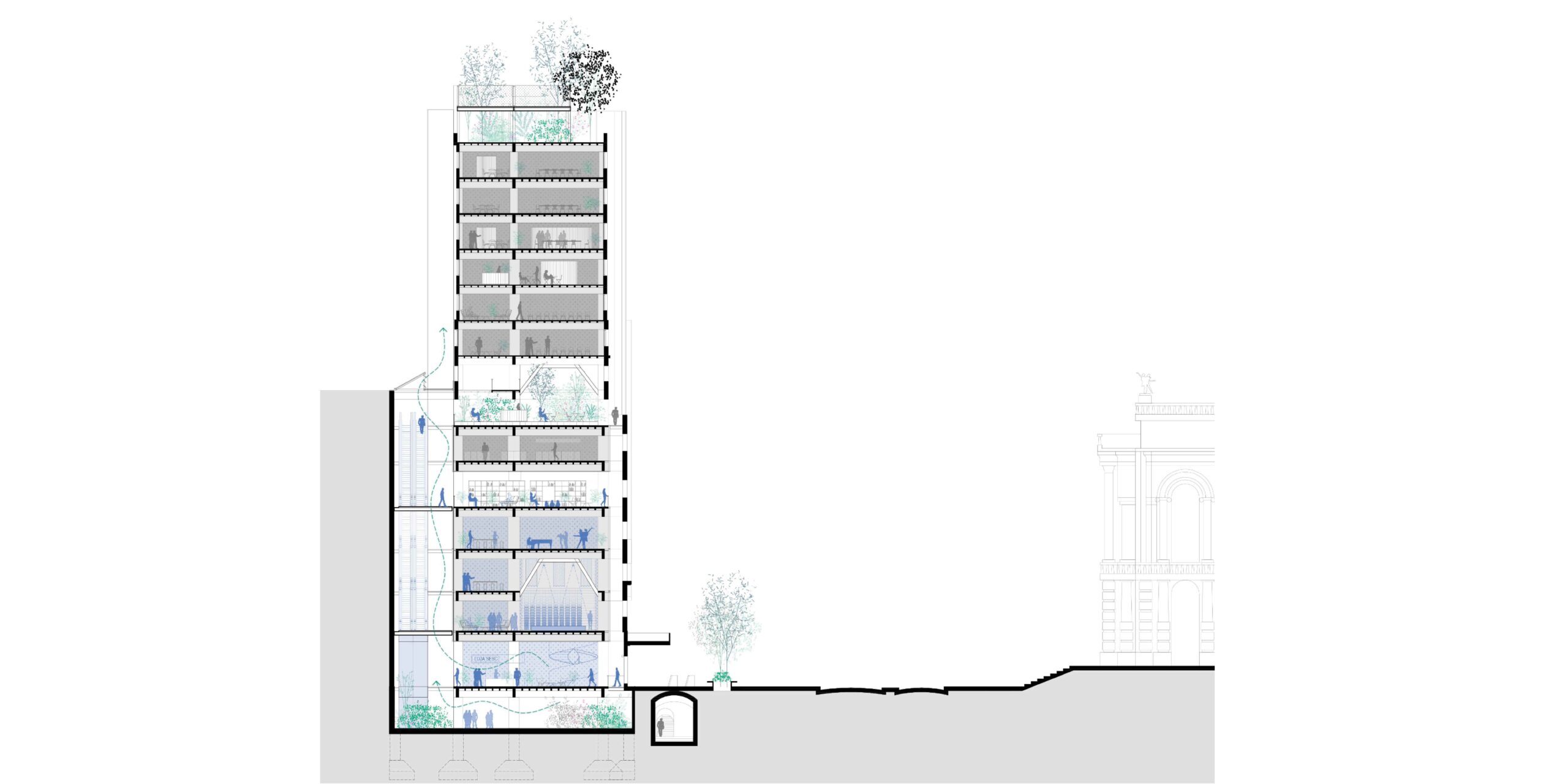 A preservação da arquitetura do edifício exige uma postura crítica em que estrutura e imagem são valorizadas segundo operações complementares. As lajes dos pavimentos correspondentes ao intervalo entre a primeira e a segunda praça, são recuadas até o alinhamento da torre. Com isso, a fachada histórica do embasamento é destacada, reforçando o seu sentido de marco cultural; ao ser vista então pela primeira vez, de um só golpe, em seu reverso, praticamente solta, sublinha a coexistência de múltiplas temporalidades. Por outro, no limite oposto do lote, o que era fundo de um edifício comercial torna-se protagonista como animado átrio avarandado, com iluminação natural por onde atravessam as escadas-rolantes. As demolições seguem um princípio técnico-poético, deixando à mostra a passagem do tempo, com suas marcas e imperfeições. Duas lajes são suprimidas para ampliar o pé-direito dos pavimentos do Bar-jardim e do Auditório. Este não se configura numa caixa-preta, com seus limites flexíveis, pode abrigar desde aulas e palestras a apresentações teatrais que contagiem os percursos verticais e horizontais do edifício. De modo geral, os espaços internos, outrora fechados, pouco ventilados e obstruídos, se tornam grandes planos com ampla iluminação e ventilação natural, garantindo um desempenho energético coerente e em consonância com as expectativas contemporâneas de um ambiente sustentável. Os jardins, além de um caráter lúdico, formam áreas de retenção das águas pluviais.